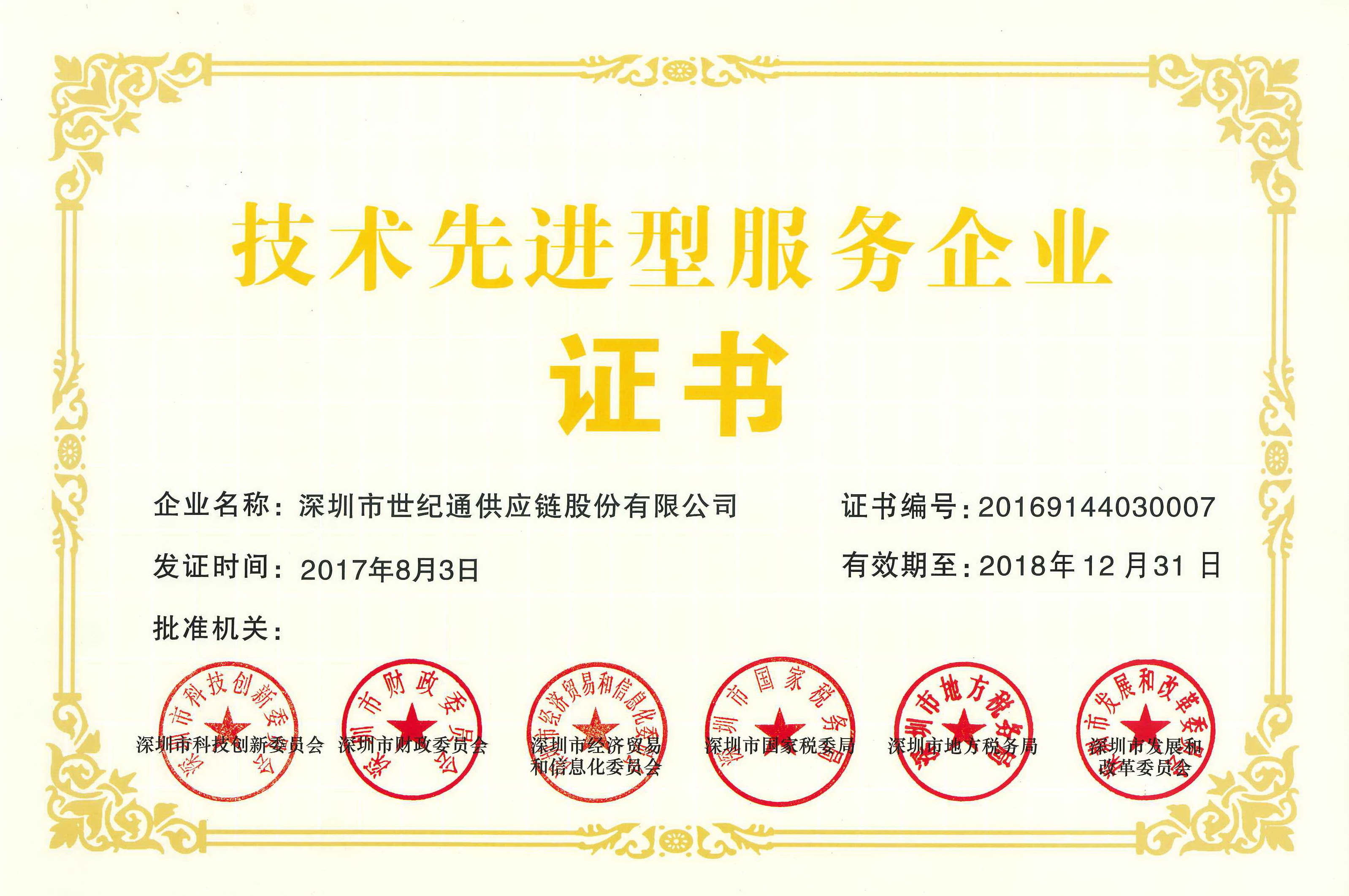 2017年8月3日,国家科技部下发通知,根据国家科技部、财政部、国家税务总局、商务部、国家发改委等部门联合下发的关于完善技术先进型服务企业政策的精神,经深圳市科技创新委员会请示,并经上述国家各部门认定和复核,深圳市世纪通供应链股份有限公司,获得“深圳市2016年度技术先进型服务企业”称号,并颁发证书及予以备案。