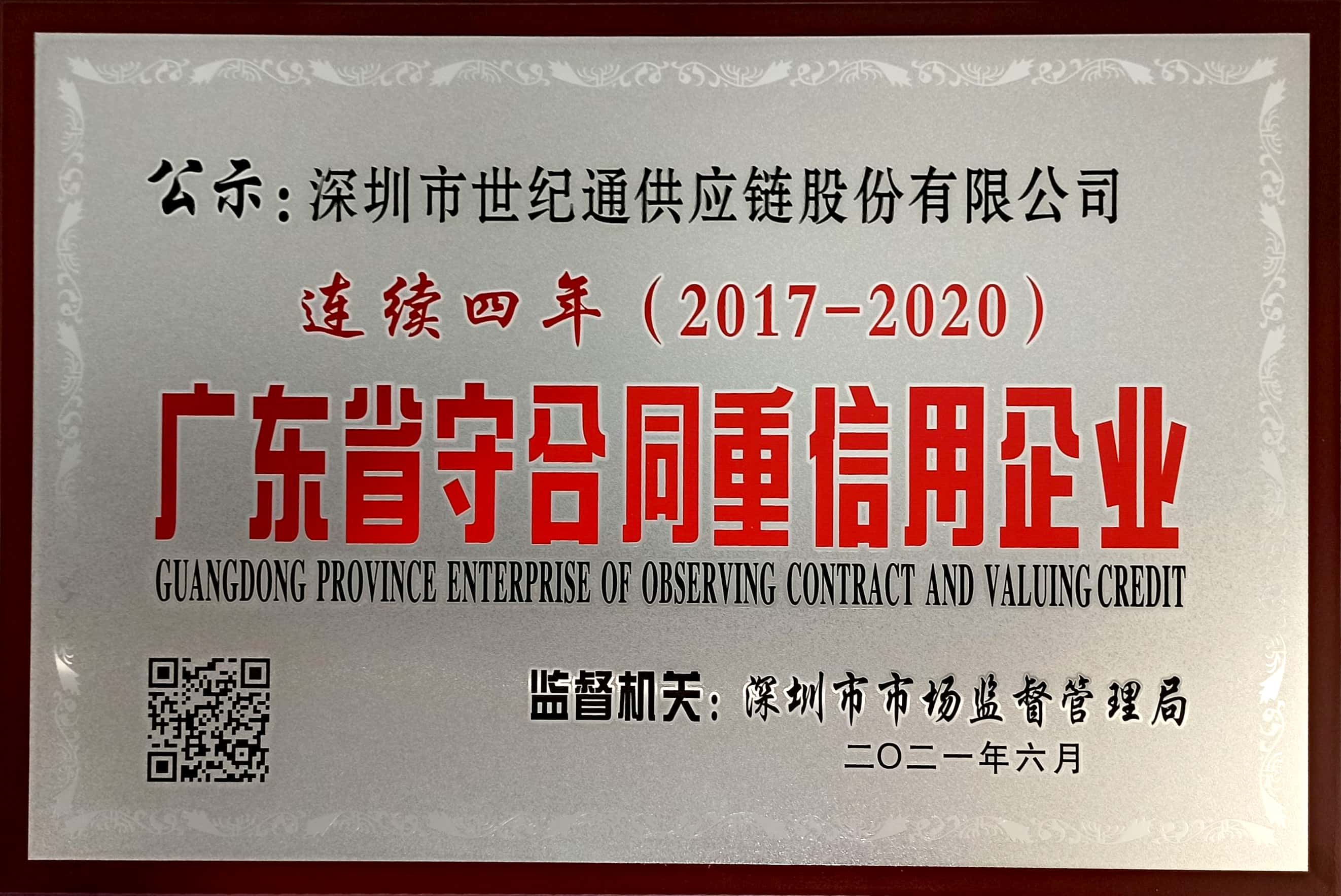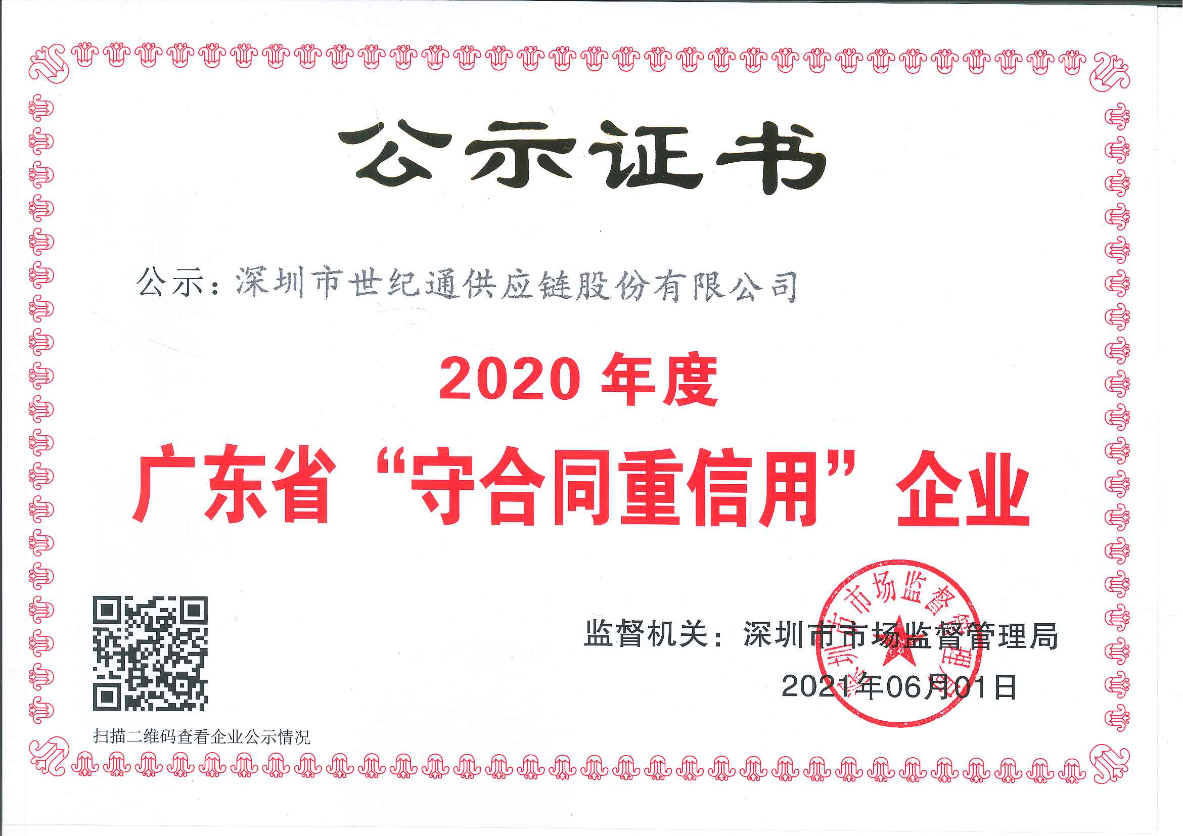 近日,深圳市市场监督管理局对2020年度“广东省守合同重信用”企业进行公示,深圳市世纪通供应链股份有限公司(以下简称世纪通)凭借良好的信用体系建设,诚信守约形象,坚持诚信为本,荣获2020年度“广东省守合同重信用企业”称号。世纪通已连续四年荣膺“广东省守合同重信用企业”殊荣。