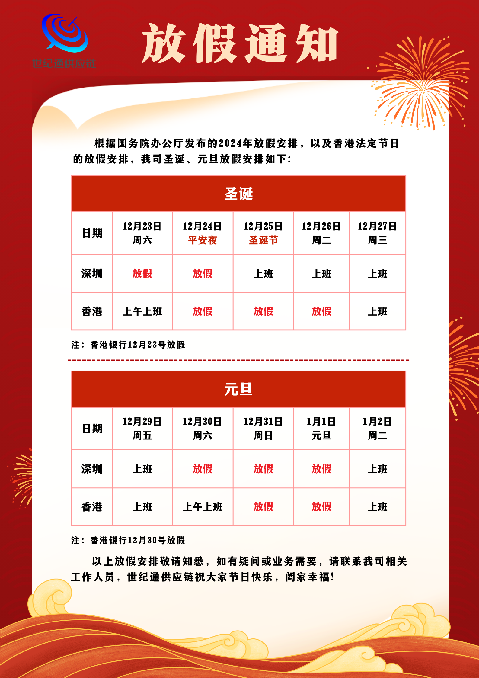 世纪通供应链2023年圣诞&2024年元旦放假通知
