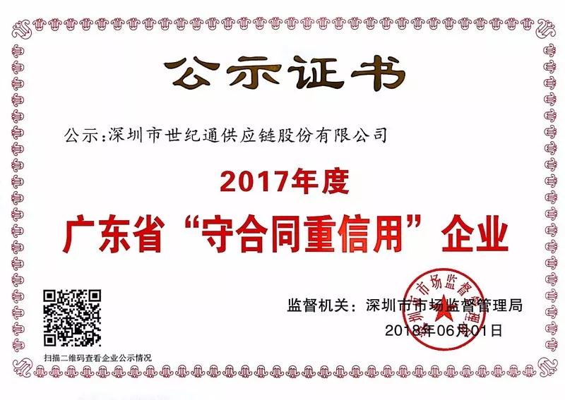近日,广东省工商局公布了“2017 年度广东省守合同重信用企业”名单。深圳市世纪通股份有限公司(简称“世纪通”)在成立十年之际,受深圳市物流与供应链管理协会的推荐,并经各级主管部门严格审查,荣获广东省“守合同重信用”企业荣誉称号。