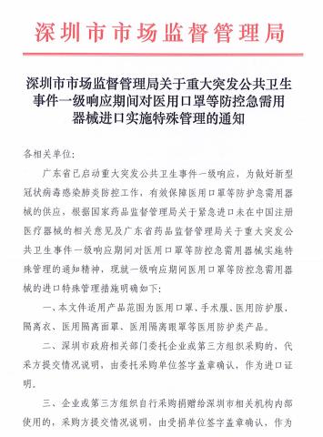 1月31日,深圳市市场监督管理局通知,在一级响应期间,未在中国注册过的医用口罩等防控急需用器械,政府相关部委、企事业单位采购捐赠,以及企业自采自用的,均可凭有关部门出具的证明资料进口通关!手术服、医用防护服、隔离衣、医用隔离面罩、医用隔离眼罩等医用防护类产品也在此范围内。