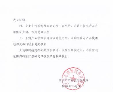 1月27日国家药品监督管理局医疗器械监督管理司发布了《关于紧急进口未在中国注册医疗器械的意见》,为满足疫情防控需要,从国外紧急进口符合美国、欧盟和日本相关标准的医疗器械,企业能够提供境外医疗器械上市证明文件和检验报告,并作出产品质量安全承诺的,可以应急使用。当地药品监督管理局视情况可出具该批物资进口证明。