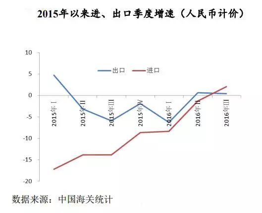 从图中可以看出,我国外贸进口增速从2015年第一季度至今一直在不断上升;而外贸出口的增速相比较去年的剧烈下滑,今年前三季度的形式更是稳中有升。